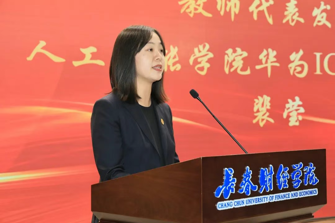 人工智能学院华为ICT中心主任裴莹博士代表教师发言。她深入阐述了新学院成立所蕴含的重大意义。她相信,“人工智能学院”必将成为创新人才的摇篮,为智能时代的发展书写属于长财的新篇章。